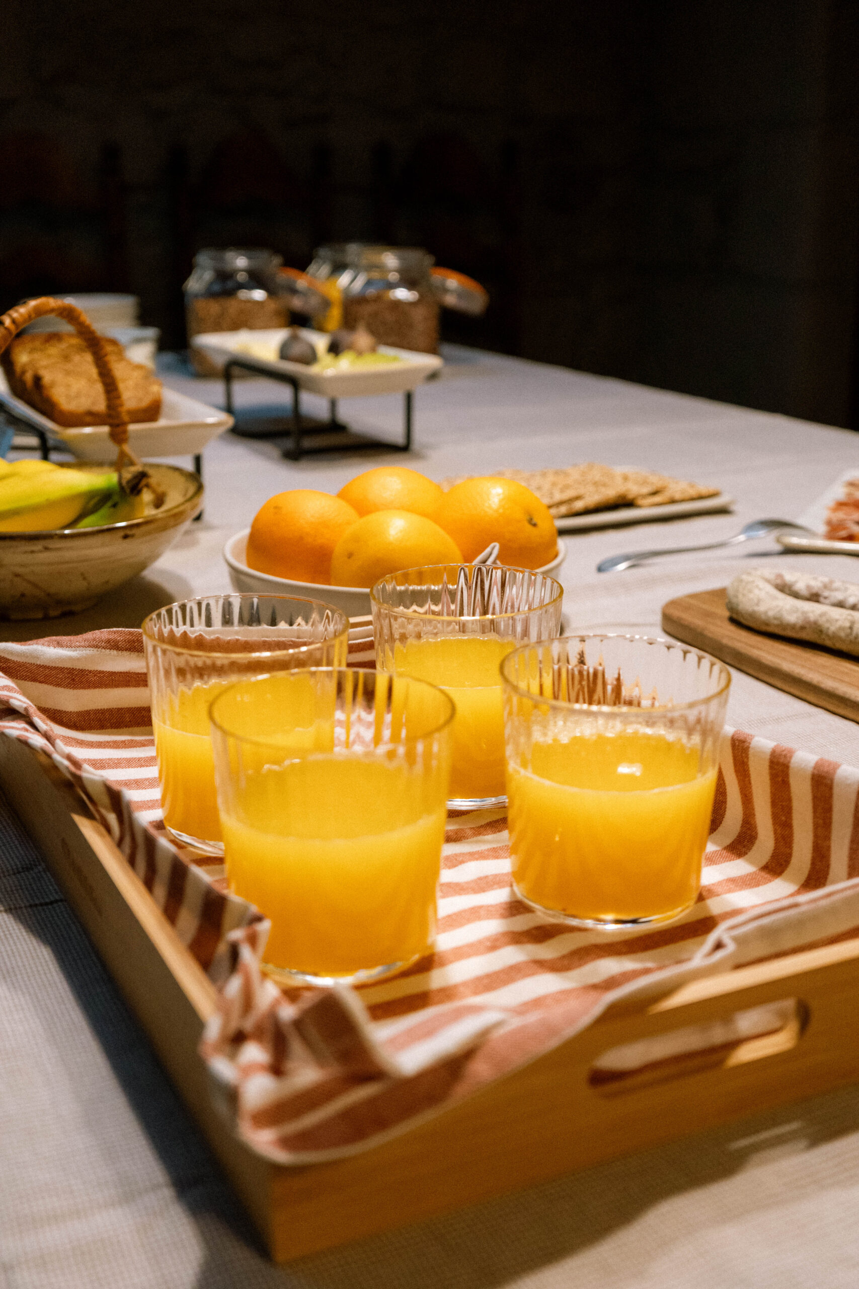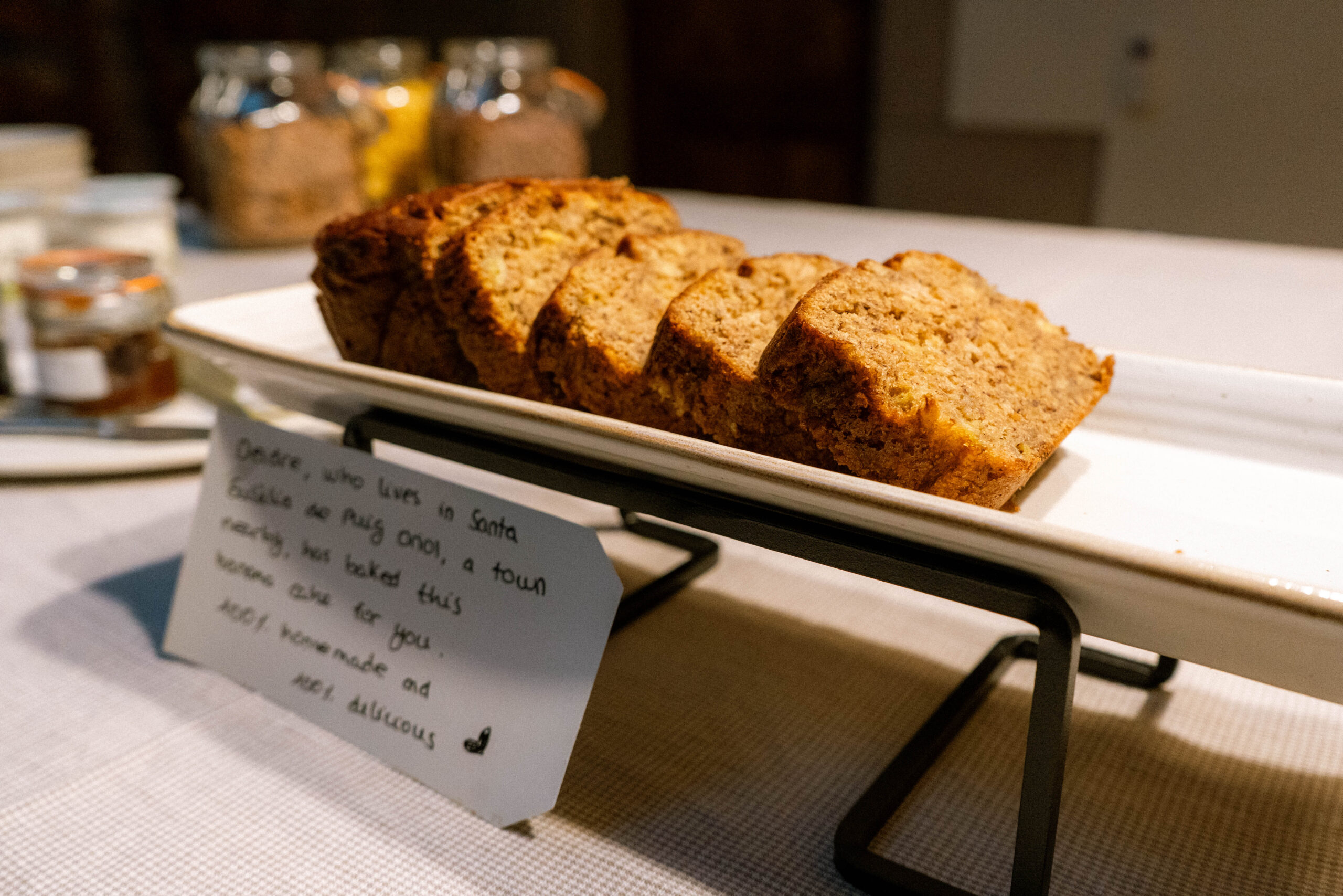 És l’esmorzar de casa nostra, servit en format bufet amb productes locals i de temporada que anem buscant als pobles del voltant. Pa acabat de fer, embotits de la zona, fruita fresca, pastissos casolans, melmelades artesanes i, quan toca, ous de les gallines del poble. Orgànic, sostenible, local i natural.
