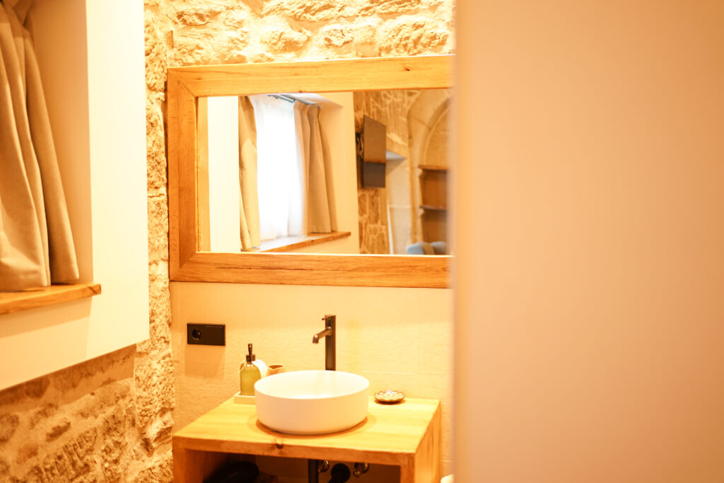 L’antiga cuina i la seva màgia. El lloc on bullien les converses, el compartir. Aquesta habitació va ser la cuina de La Serra Sport & Wellness i encara en conserva l’essència: els antics fogons convertits en armari, una immensa pica de pedra treballada a mà i l’arc del vell plater, avui transformat en unes prestatgeries de roure restaurat. L’antic i el modern s’hi fusionen, mentre la llum entra generosa per dues grans finestres, creant un espai íntim, càlid i acollidor que convida al descans i a sentir-se com a casa.