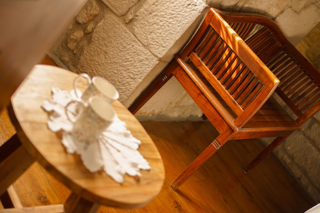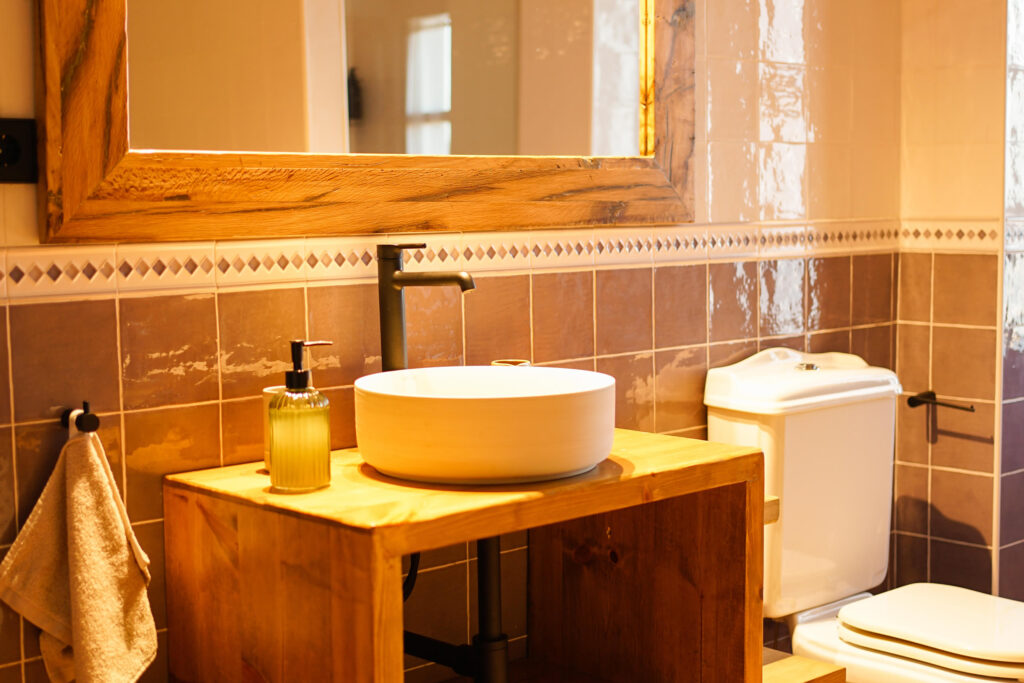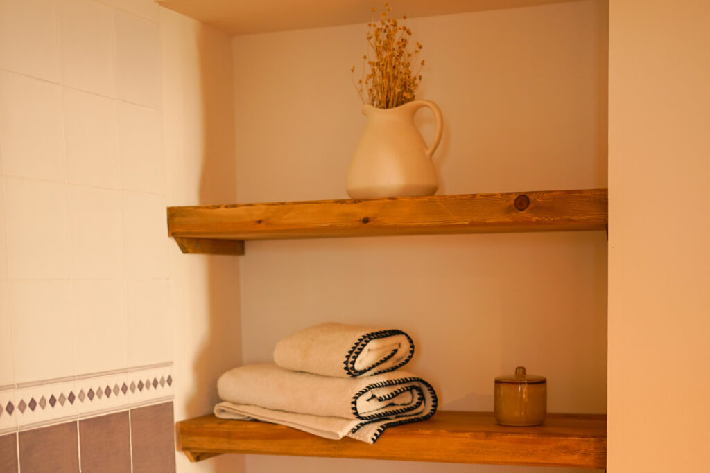 La Torreta és el tresor elevat de la masia. Situada a la part superior de la casa, conserva l’estructura original de l’antiga torreta: un espai històric que, en el seu moment, servia com a punt elevat dins la finca i que encara manté aquest caràcter recollit i especial. El sostre inclinat i les bigues de fusta restaurades li donen una personalitat càlida i autèntica. És una habitació pensada per a la calma: tranquil·la, discreta i acollidora, ideal per descansar i sentir la casa com un petit refugi.